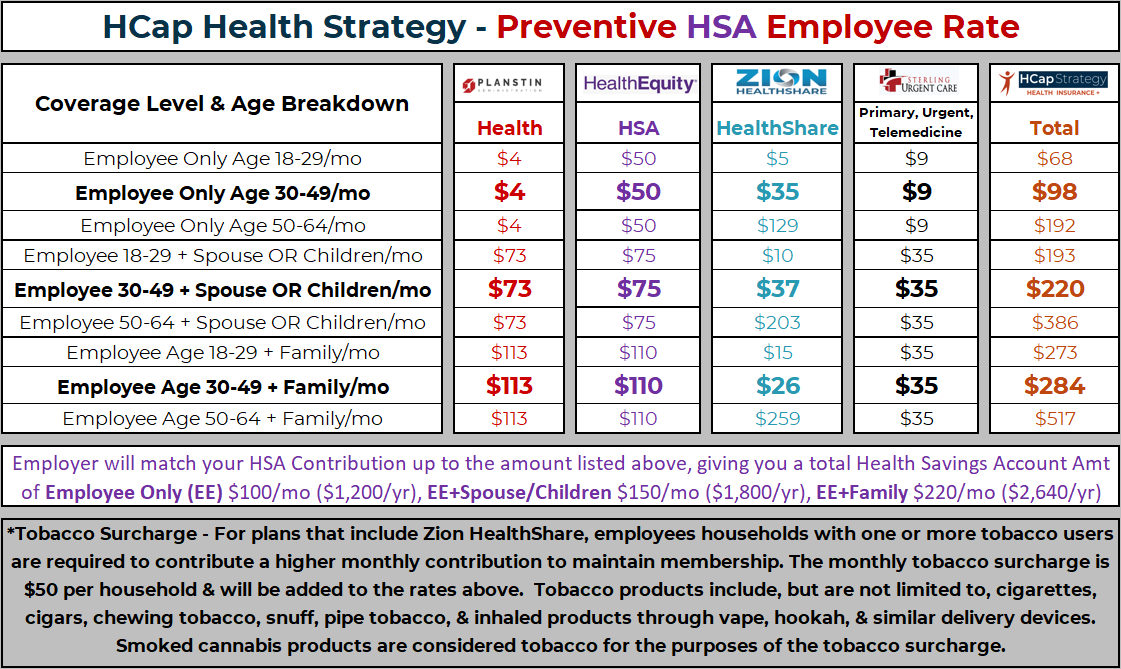 Planstin Preventive MEC Plan Pairing with Zion HealthShare means no deductible to meet, rather for any qualifying expense (see Zion HealthShare member guidelines), you pay the first $1,250 (known as your Initial Unshareable Amount or IUA) of qualifying medical events and the HealthShare pays the rest. After you pay 3 IUAs, in a 12 month period, any other major event over $500 is paid by Zion HealthShare w/o requiring another $1,250 IUA. More money can go into your Health Savings Account if the HSA Plan is selected or choose the Copay plan if you prefer a copay instead of receiving HSA dollars. All Preventive care 100% covered. Rx Discounts.
