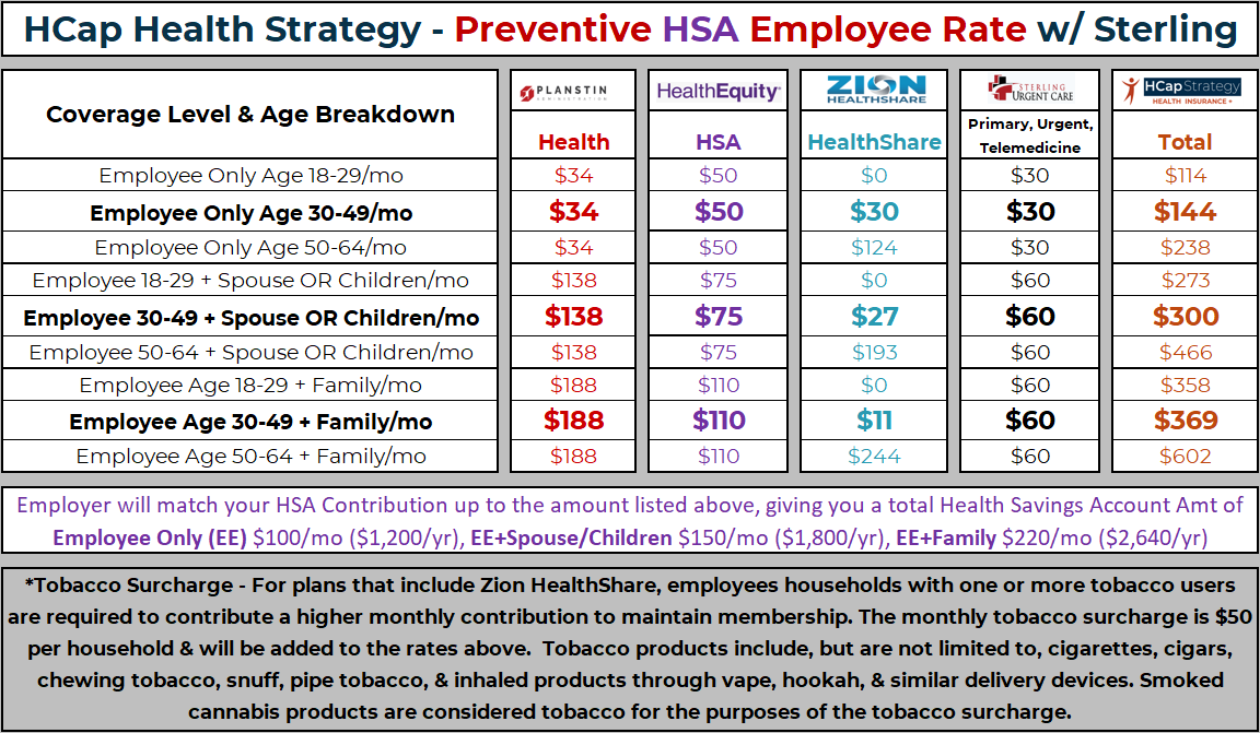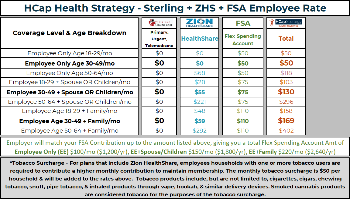 For larger claims that can’t be treated at a Sterling Urgent Clinic or for Maternity, a Zion HealthShare Membership is also included to provide comprehensive coverage. Pre-Membership conditions do have a phase in period per the Zion HealthShare Member Guidelines on this plan.