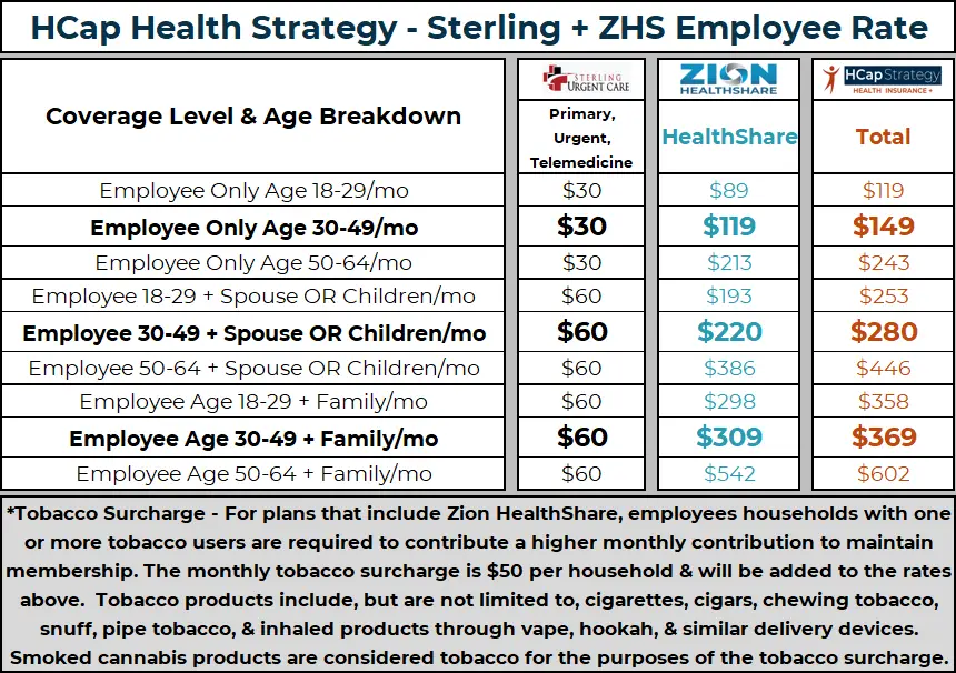 For larger claims that can’t be treated at a Sterling Urgent Clinic or for Maternity, a Zion HealthShare Membership is also included to provide comprehensive coverage. Pre-Membership conditions do have a phase in period per the Zion HealthShare Member Guidelines on this plan.