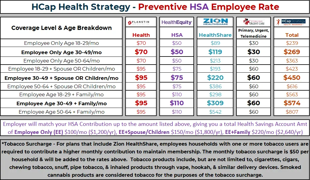 Planstin Preventive MEC Plan Pairing with Zion HealthShare means no deductible to meet, rather for any qualifying expense (see Zion HealthShare member guidelines), you pay the first $1,250 (known as your Initial Unshareable Amount or IUA) of qualifying medical events and the HealthShare pays the rest. After you pay 3 IUAs, in a 12 month period, any other major event over $500 is paid by Zion HealthShare w/o requiring another $1,250 IUA. More money can go into your Health Savings Account if the HSA Plan is selected or choose the Copay plan if you prefer a copay instead of receiving HSA dollars. All Preventive care 100% covered. Rx Discounts.