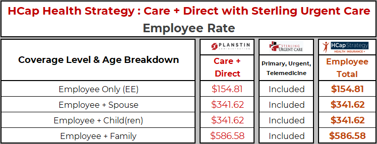 By combining Sterling Urgent Care Clinics and Planstin’s Care you receive your care at $0 cost with your deductible waived. Procedures that can be accomplished at Sterling Medical Clinic will are at $0 cost to you. Care outside of Sterling Medical Clinics can also be accomplished at $0 cost to you through using Planstin’s Care Coordination Team. Emergency Room and Emergency Transport will be applied to your deductible and max out of pocket of this plan. Affordable, comprehensive insurance coverage is here!