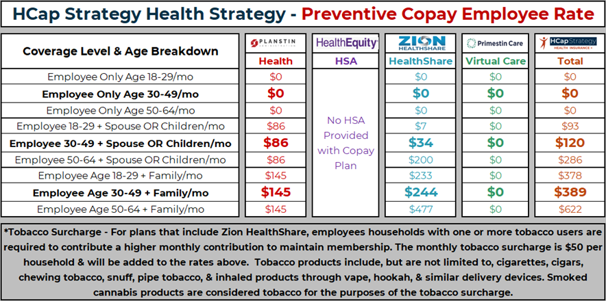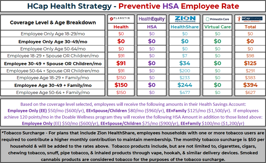 Planstin Preventive MEC Plan Pairing with Zion HealthShare means no deductible to meet, rather for any qualifying expense (see Zion HealthShare member guidelines), you pay the first $1,250 (known as your Initial Unshareable Amount or IUA) of qualifying medical events and the HealthShare pays the rest. After you pay 3 IUAs, in a 12 month period, any other major event over $500 is paid by Zion HealthShare w/o requiring another $1,250 IUA. More money can go into your Health Savings Account if the HSA Plan is selected or choose the Copay plan if you prefer a copay instead of receiving HSA dollars. All Preventive care 100% covered. Rx Discounts.