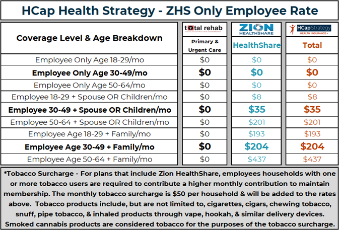 Your employment with Total Rehab can be combined with a Zion HealthShare Membership as a powerful way to control costs on medical expenses and be a comprehensive health strategy.